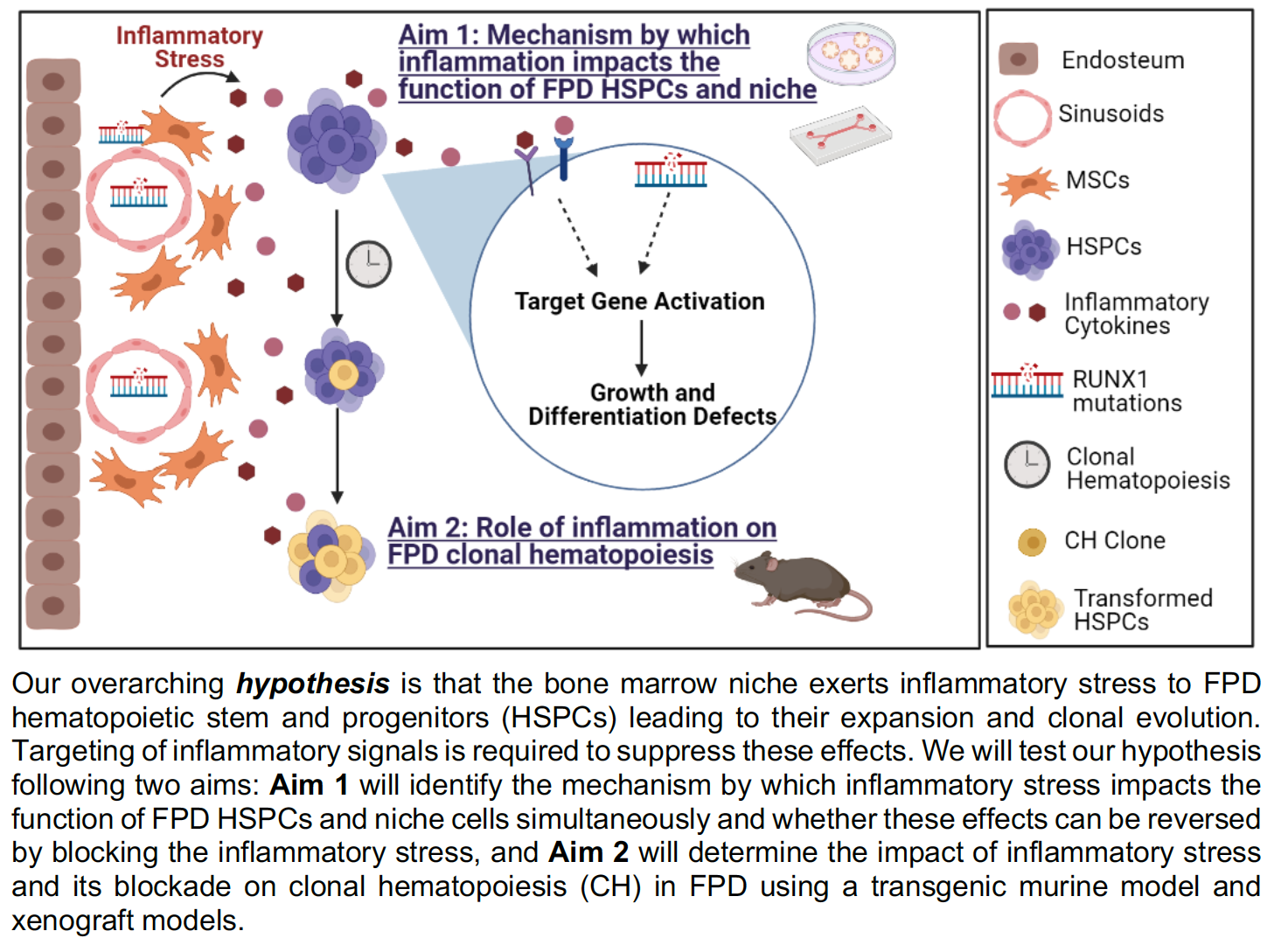 We propose that in FPD the surrounding bone marrow microenvironment (niche) exerts inflammatory stress to primitive hematopoietic stem and progenitors (HSPCs) to provide them a growth advantage and promote their clonal hematopoiesis, eventually leading to the disease evolution. Our hypothesis is based on the following evidence. Several studies have shown that inflammation contributes to the development of MDS and AML. Inflammatory and immune dysregulation may also have a role in disease progression in patients with CH. A recent NIH clinical study suggests that many individuals in families with FPD have inflammatory conditions such as skin allergies, arthritis, and eczema, which raise the concern whether inflammation may also contribute to the FPD phenotype and leukemia transformation. Accordingly, we found FPD patients have high levels of secreted inflammatory cytokines and growth factors in the bone marrow microenvironment. Further, we found that in FPD stromal microenvironment itself is defective in function and leads to increased growth and differentiation defects of primitive HSPCs. These results suggest that the bone marrow niche contributes to the clinical characteristics of FPD and has a role in clonal evolution. This highlights the importance of studying ways to disrupt the microenvironment-driven signaling cues to suppress clonal evolution in FPD. Therefore, we will identify the mechanism by which inflammatory stress impacts functions of primitive FPD cells and niche cells simultaneously using new “co-culture” models. We will also determine how blocking inflammatory stress impacts CH in FPD. By unraveling how inflammation drives this clonal selection process, we can identify effective therapies to prevent or delay leukemia initiation, clonal hematopoiesis, and leukemia progression. These inhibitors may also rescue growth and differentiation defects of HSPCs and niche cells to design better surveillance strategies. The aims proposed here are unique as they will identify clinically actionable pathways using orthogonal approaches. To accomplish the proposed goals, we have gathered a multidisciplinary team with expertise in bioengineering, bioinformatics, single cell analysis, and initiating clinical trials. A support from the joint RUNX1 Research Program-EvanMDS foundation is critical to help us move this field forward, catalyze future funding from the NIH, and fulfill the unmet need of improving outcomes for FPD patients.