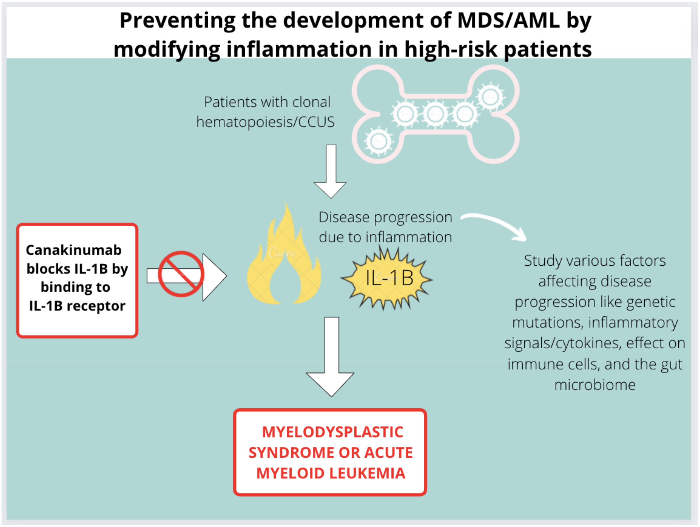 One such anti-inflammatory treatment is canakinumab, a monoclonal anti-human IL-1β antibody which is already approved for the treatment of inflammatory diseases by the Food and Drug Administration (FDA). Canakinumab blocks the interaction of IL-1β with the IL-1 receptor (IL-1R) by binding to human IL-1β. This stops the production of an inflammatory response (with other cytokines) that would otherwise worsen CH and promote the development of MDS or AML. In a large study, called the CANTOS trial, Canakinumab was shown to be effective in delaying progression of lung cancer by inhibiting IL-1β. Patients with low red blood counts (anemia) were found show improvement on this trial. This may suggest that this anti-inflammatory therapy may help prevent decreasing blood cell counts.