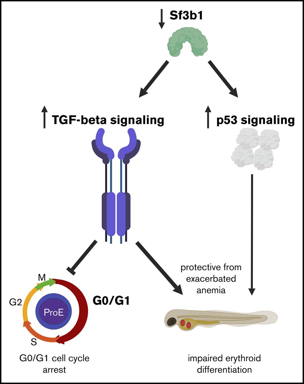Adriana De La Garza, Rosannah C. Cameron, Varun Gupta, Ellen Fraint, Sara Nik, and Teresa V. Bowman, The splicing factor Sf3b1 regulates erythroid maturation and proliferation via TGFβ signaling in zebrafish, Blood Advances 2019, 3, 2093, DOI: 10.1182/bloodadvances.2018027714