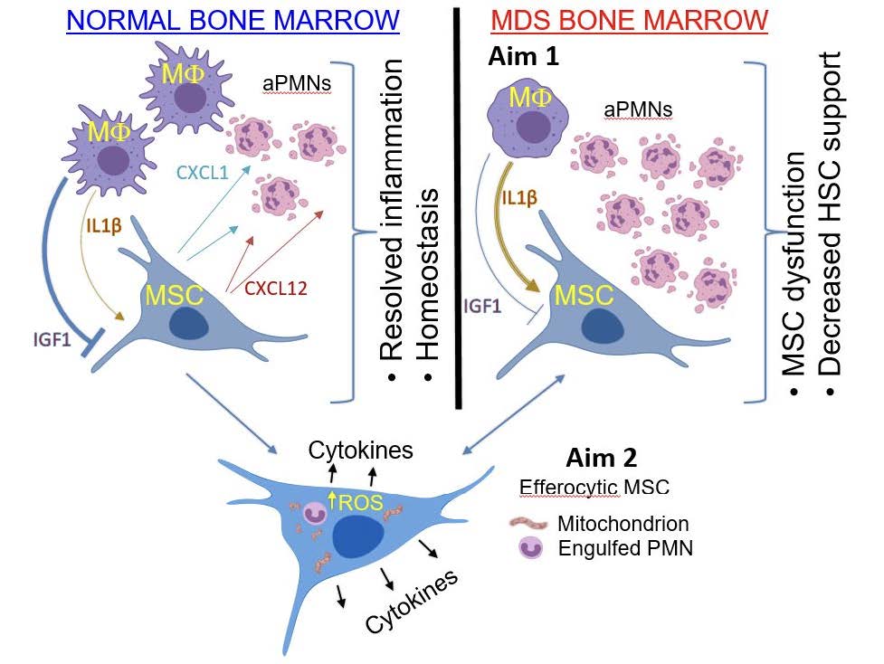 MDS resides in the bone marrow, where they interacts with the bone marrow microenvironment, which also supports normal blood stem cells. Many studies have shown that MDS is dependent on the microenvironment, which is abnormal and no longer supports normal blood stem cells. This work aims to understand a new mechanism that initiates dysfunction of the bone marrow microenvironment in MDS. We discovered that mesenchymal stromal cells, critical cells for the support of blood stem cells, contribute to the clearance of dead cells in the bone marrow. This activity is rare at baseline, but we have found that this activity is increased with aging and in MDS. During year 1, we identified defects in the engulfment of apoptotic cells by hematopoietic cells carrying the IDH2R172K mutation. The mutation was present in all differentiated cells derived from these mutant stem cells, including the bone marrow derived macrophages, which were defective in engulfing dying cells (efferocytosis). Over the past year, we have identified the specific mechanism that these microenvironmental cells use to engulf dying cells (the Axl and Tyro3 efferocytic receptors). Using a genetic model that genetically induces increased engulfment by MSCs, the cells have further increase in senescence. We have also identified IGF1 and Interleukin 1 from macrophages as key signals that regulate microenvironmental cells to do the engulfment. Importantly, we demonstrate that MSCs from mice with the IDH2R172K mutation have increased efferocytosis, are dysfunctional and have increased rates of senescence.