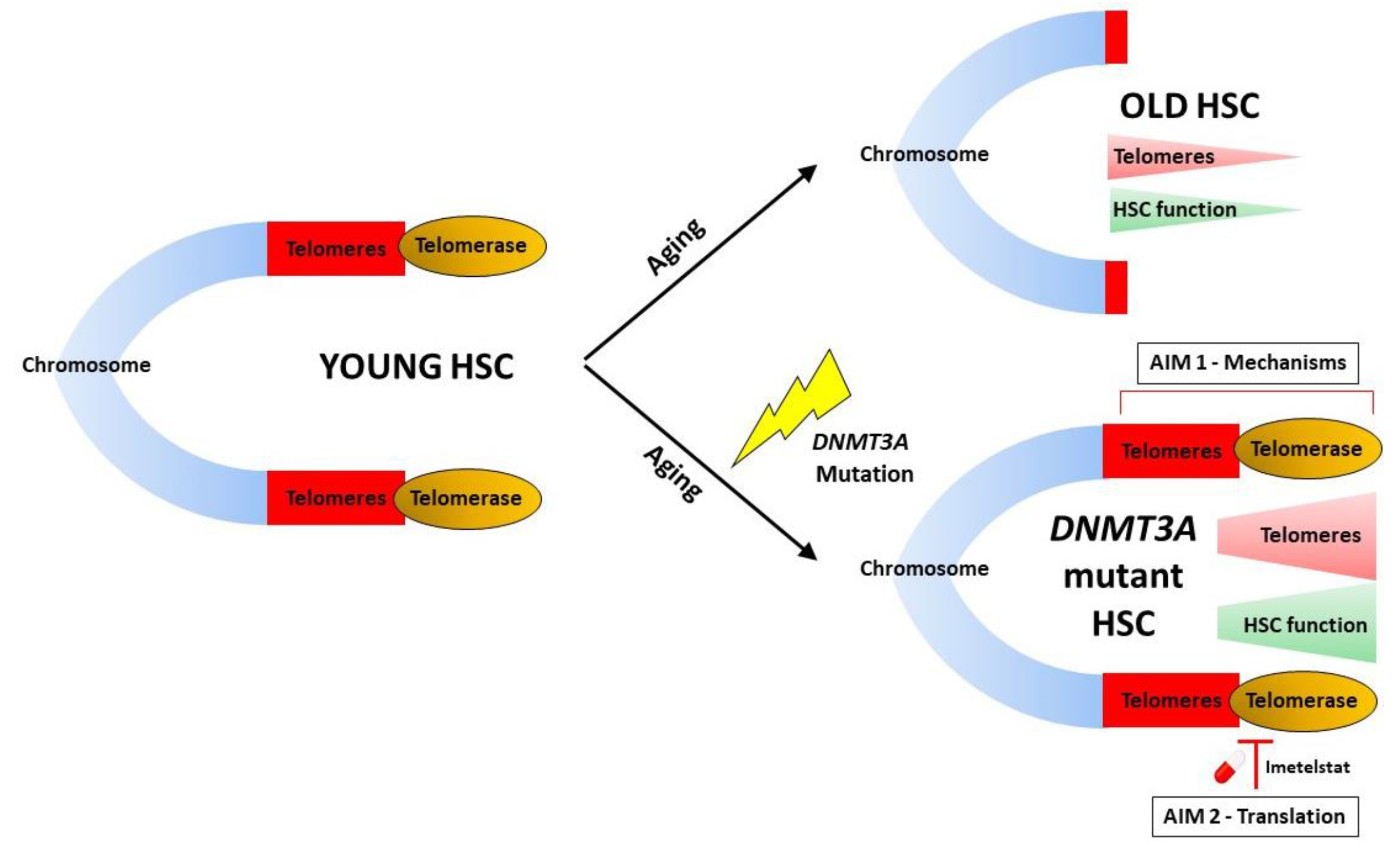 Many mutations which provide HSCs with abnormal growth in CH are also driving forces for development of MDS. The most recurrently mutated gene in people with CH encodes a gene called DNMT3A, which is also one of the most frequently mutated gene in MDS patients and is regarded as a driver of the disease. DNMT3A mutations in HSCs lead to increased “fitness” or “competitive advantage” over wild-type HSCs. This means they grow faster than normal HSCs, resulting in them dominating the bone marrow and blood. We use mouse with genetic modifications that mimic the DNMT3A mutations found in humans to study the effect these mutations have on blood cell function. We have found that these mutations greatly extend the lifespan of HSCs, allowing them to survive far beyond the normal limits. Normally, HSCs have restrictions that limit their lifespan, one of which are structures on the end of chromosomes called telomeres. Telomeres are repetitive DNA sequences found at the end of chromosomes that serve as a cap to protect the ends of the chromosomes from DNA damage. However, telomeres get shorter every time a cell divides because the enzymes that copy the DNA cannot fully replicate the very ends of the chromosomes. When telomeres become reduced to a certain threshold, HSCs cannot function any more and either die or become dormant. We have found that HSCs with mutations in DNMT3A are able to overcome this barrier of telomere shortening to allow them to live forever. The DNMT3A protein has not previously been regarded as part of the machinery that regulates telomere length in HSCs. However, our new data indicates that DNMT3A normally serves to limit the replicative lifespan of HSCs (perhaps as a safeguard to protect them from acquiring pathogenic mutations) and that when the cells mutate this gene, they are able to persist and gain clonal dominance. This appears to be one of the first steps to development of MDS, as DNMT3A mutations in MDS patients are also associated with longer telomeres. This is an exciting new finding because it presents a new avenue for treatment of these patients. There is a molecule called Imetelstat that can inhibit the telomerase complex which extends telomeres, and is in clinical trials for MDS patients. But to date, there is no understanding for which patients may benefit from Imetelstat therapy. We have identified a potentially novel link between DNMT3A mutations and telomeres, and the goal of this proposal is to use our unique experimental systems to solidify this link so that MDS patients with these mutations can be prioritized to benefit from this treatment.