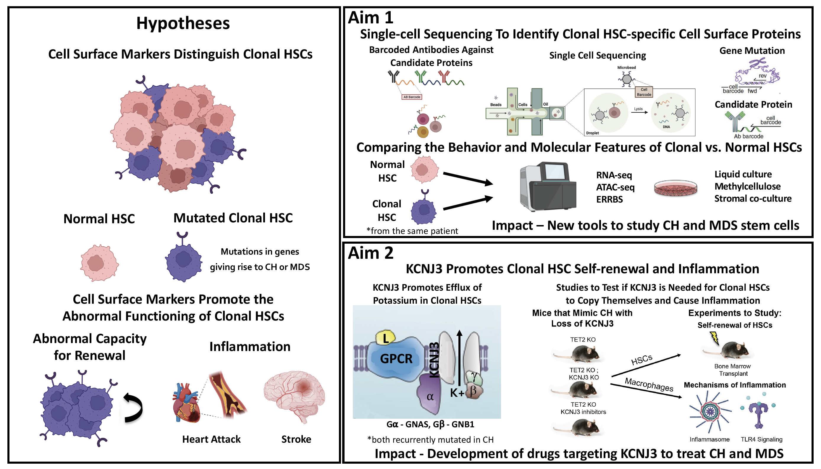 However, understanding how mutated blood forming stem cells cause MDS and CH has been challenging because there are currently no known protein markers for distinguishing normal from abnormal blood forming stem cells in MDS and CH. Using new technologies that can measure both protein markers and gene mutation data in single stem cells, we have identified proteins that are present on the surface of MDS and CH stem cells but are not present on normal blood stem cells. This gives us the unprecedented ability to compare mutated MDS and CH stem cells with their normal counterparts, all within the same patient. We additionally plan to study how one of these proteins enables MDS and CH stem cells to outgrow their normal counterparts and cause disease by using mouse models missing this protein and by testing drugs that target it. Together, this research promises to yield new insights into the mechanisms by which mutated blood forming stem cells promote adverse clinical outcomes, while also identifying new tools for the diagnosis and treatment of patients with CH and MDS.