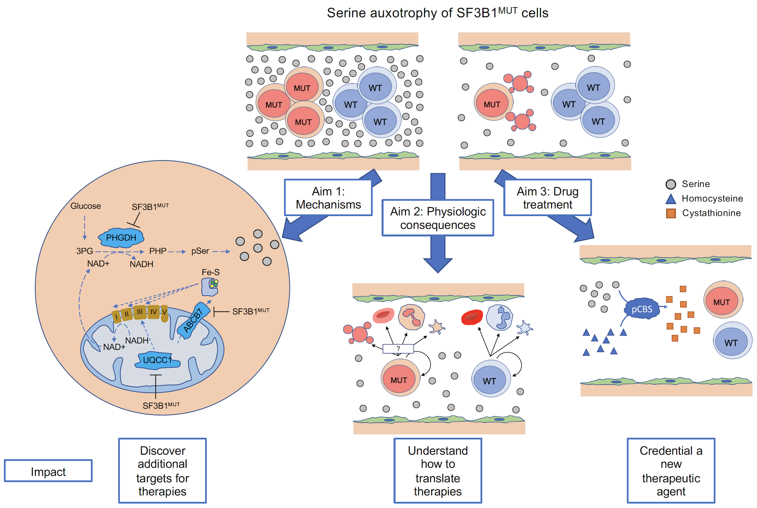 Certain forms of myelodysplastic syndrome (MDS) are caused by a DNA mutation in a gene called SF3B1. This mutation is quite frequent, occurring in greater than 30% of patients with MDS. SF3B1 mutations mess up a process called RNA splicing, but we still don’t understand very well how this causes cancer. We also don’t yet have drugs that can specifically target cancers with SF3B1 mutations, but we need them. In our recent laboratory work, we found that SF3B1 mutations also mess up metabolism, the process by which cells get and use nutrients to grow and survive. We found that cells with SF3B1 mutation must get a nutrient called serine from their environment, in contrast to all other cells in the body, which can make serine for themselves. Because of this different need, reducing serine in the blood can slow the growth of cancer cells with SF3B1 mutation, while sparing healthy cells that make their own serine.