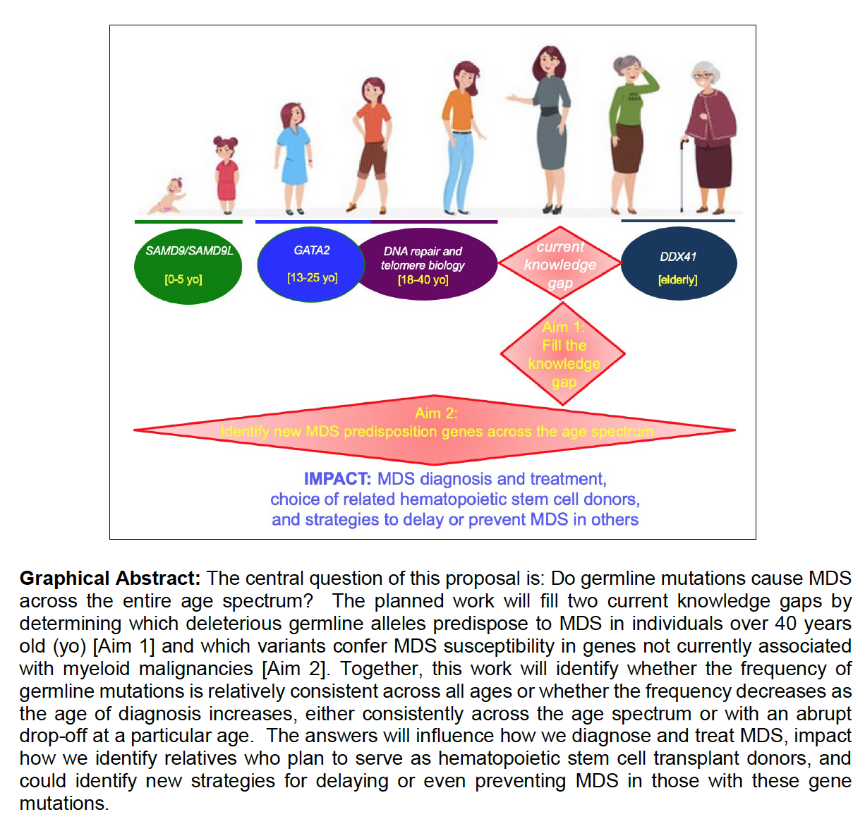 Despite the increasing appreciation for the role of germline DNA mutations in driving MDS, we still have two large gaps in our knowledge: We do not know which germline DNA mutations predispose to the development of MDS in those diagnosed from 41 years old and up into the elderly age range. This is an important gap to fill, since these cases represent the majority of individuals diagnosed with this disease, many of whom are eligible for curative stem cell transplants. Because relatives are the preferred stem cell donors, it is critical to identify which patients have inherited DNA mutations to avoid re-introduction of the mutation as well as risk to the donor from the process of collecting the stem cells. Moreover, we do not know if we have identified all of the genes in which germline DNA mutations cause MDS, so we may not even have a full list of MDS predisposition genes. Without a complete list of MDS-risk genes, we are failing to recognize MDS patients and families with germline predisposition and therefore are not counseling or treating them adequately.
