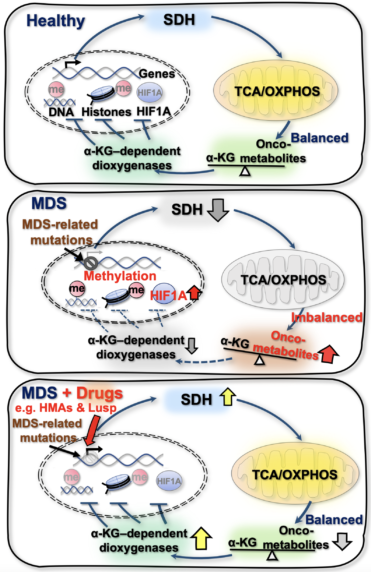 Myelodysplastic syndromes (MDS) are a group of diseases of hematopoietic stem cells (HSCs) that occur primarily in the aging population. Allogeneic stem cell transplantation is the only curative treatment, but has marked limitations in most MDS patients. The standard-of-care, which focuses on hypomethylating agents (HMAs), invariably results in resistance and disease progression. Thus, there is a dire need for the development of new therapeutic approaches, but this is constrained by the lack of a clear understanding of the molecular pathobiology which underlies MDS. Recently, we have performed informatics analyses of primary MDS samples which demonstrate that a subset of patients have downregulation of genes, including SDHA, SDHB, and SDHD, that encode subunits and assembly factors of mitochondrial complex II (also known as succinate dehydrogenase: SDH). We confirmed this finding in hematopoietic stem and progenitor cells (HSPCs) of several genetically-distinct mouse models of MDS. Notably, downregulation of SDH results in suppression of the mitochondrial Krebs cycle and oxidative phosphorylation. The metabolic sequelae include an accumulation of Krebs cycle intermediate metabolites, which could act as antagonists to competitively inhibit the activity of various α-KG– dependent dioxygenases (2OGDDs). Collectively, these observations suggest that SDH dysregulation and/or downstream inhibition of 2OGDDs may drive MDS. Importantly, the downstream effect of these changes appears to be reminiscent of mutant isocitrate dehydrogenases (IDHs) and a non-canonical function of lactate dehydrogenase (LDH), which produce the oncometabolites R- or S-2-hydroxyglutarate (R/S-2HG) to competitively inhibit the activity of various 2OGDDs. Potentially related to our findings of downregulation of SDH genes in MDS, the IDH1/2 genes are often mutated, and that serum LDH levels have prognostic importance for survival in MDS and AML . Although mutations of SDH genes have not yet been reported in MDS and AML, they are frequently mutated in various other types of cancer. Strikingly, we observed that HMAs induce re-expression of SDH proteins in MDS HSPCs, especially SDHD and SDHAF2. Additionally, overexpression of Sdhd in MDS HSPCs restores their ability to differentiate and HMA treatment enhances these effects. We therefore hypothesize that SDH downregulation is a key molecular mechanism underlying the pathobiology of a subset of cases of myelodysplastic syndrome (MDS) and that SDH is a novel therapeutic target of DNA hypomethylating agents (HMAs). Dissecting the role of SDH in MDS should improve diagnosis, pathobiology, and targeted therapy for MDS, and potentially provide a new molecular metric for successful HMA therapy of MDS.
