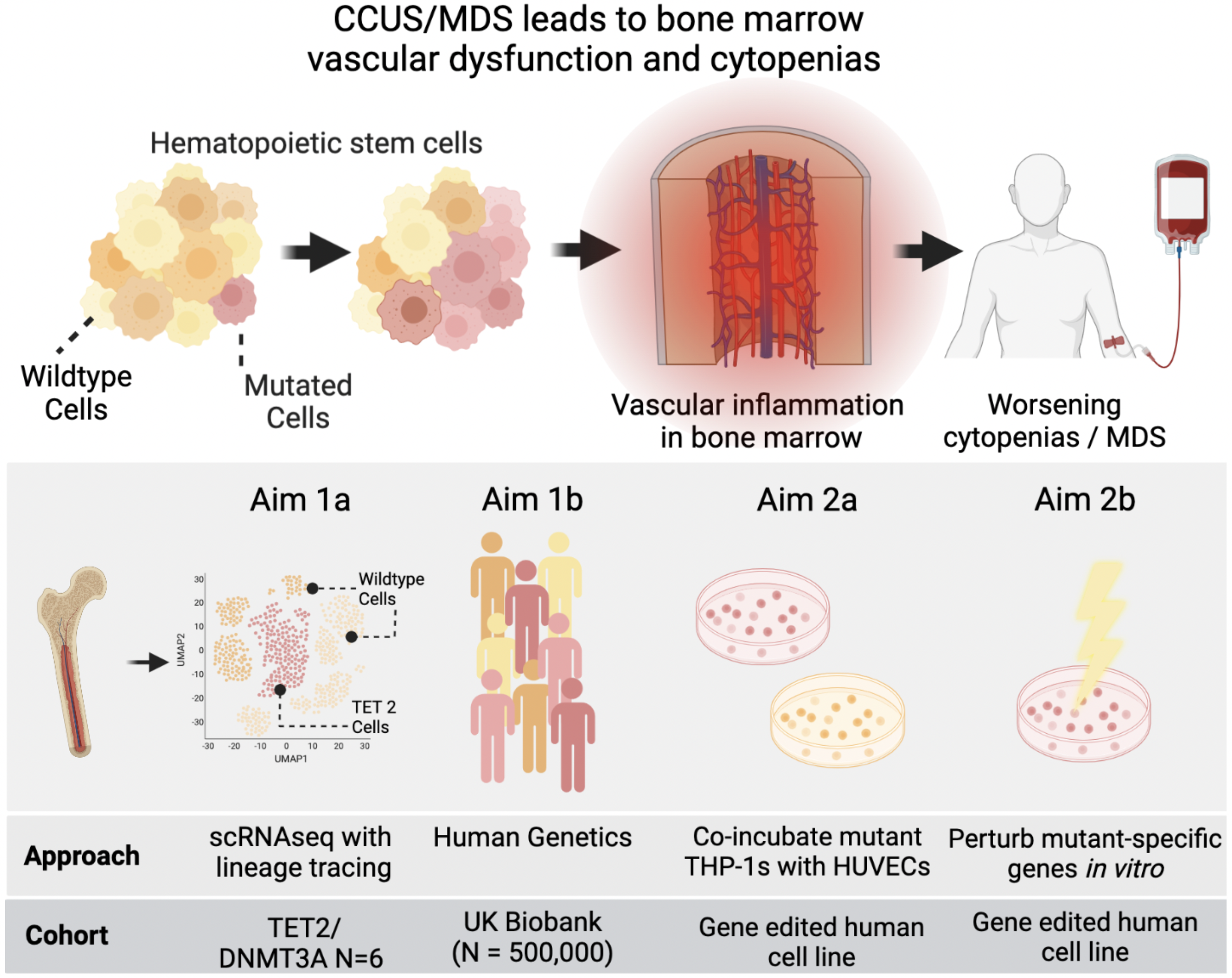 MDS or myelodysplastic syndrome is a disease that affects blood production and causes low blood cell counts. There is a similar condition called clonal cytopenia of undetermined significance (CCUS) that can develop into MDS. We believe that problems with the blood vessels in the bone marrow may play a role in causing low blood counts in MDS. We recently used a new method to examine the genes and cells of patients with CCUS who have common mutations in MDS genes. The results showed that the mutated cells had altered gene expression and caused inflammation. This led us to speculate that similar gene expression patterns cause blood vessel dysfunction in MDS. Using cutting edge techniques to find mutated cells in the blood of patients, further tests will be done to see if these mutated cells impact the blood vessels in the bone marrow, and ultimately progression of cytopenias in MDS. This includes looking at cells from the bone marrow of CCUS patients and using a large database of people with MDS mutations to see if certain gene changes protect them from worsening. We will additionally test these findings using lab-manufactured cells containing MDS mutations to confirm our results. The goal of these experiments is to learn more about the role of these mutated cells in the disease and find potential treatment targets, ultimately improving the lifespan of patients with MDS.