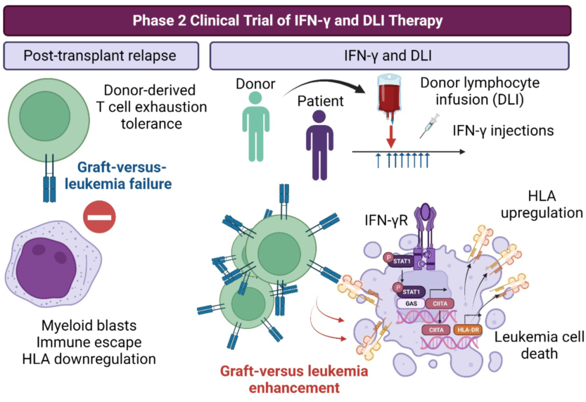 Allogeneic hematopoietic stem cell transplantation (alloSCT) can potentially cure the patients with high-risk myelodysplastic syndrome (MDS). Donor-derived immune cells mediated graft- versus-leukemia effect (GVL) and kill abnormal MDS cells. However, GVL failure can lead to the reappearance of abnormal MDS cells (i.e., relapse) even after transplantation. Unfortunately, nearly one-third of the MDS patients die from relapse after alloSCT. Effective therapy has not been established for relapse after transplant. Based on results from animal studies, we developed the clinical trial utilizing the cytokine called “interferon-gamma” to strengthen the GVL for the patients with myeloid malignancies including MDS and acute myeloid leukemia (AML). Interferon-gamma is approved to treat chronic granulomatous disease, a rare inherited immunodeficiency; however, interferon-gamma had never before been tested for the treatment of relapsed MDS/AML after alloSCT. In a pilot study, we treated 4 patients with relapsed AML/MDS after alloSCT with interferon-gamma. All patients tolerated interferon-gamma well without unexpected side effects. Three patients achieved complete remissions after treatment with interferon-gamma combined with donor lymphocytes infusion harvested from their original stem cell donor. In this proposal, we plan to treat more patients to confirm the efficacy of the interferon-gamma and donor lymphocyte combination therapy and perform studies to better understand how interferon-gamma acts on malignant cells. Should this trial confirm the efficacy observed in our pilot study, this would allow more MDS patients to receive alloSCT and eventually improve the survival of MDS patients.