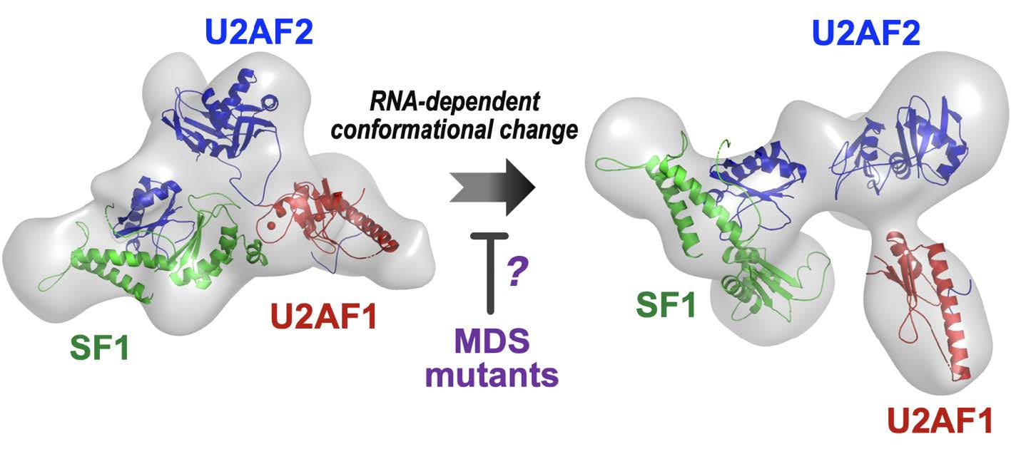 U2AF1 is one of the most frequently mutated genes in patients with myelodysplastic syndromes (MDS). The common mutations change specific amino acids of the encoded U2AF1 protein. The U2AF1 protein recognizes the splice site of the pre-mRNA transcript as a multimeric complex with two other proteins, U2AF2 and SF1. A revolutionary new technique, cryo-electron microscopy (cryoEM), has revealed 3-D structures of the core spliceosome machinery for processing gene transcripts. Yet, the 3-D structure of the U2AF1–U2AF2–SF1 complex and how it is altered by the MDS-associated mutations is unknown. To address this gap, we are using the state-of-the-art, cryoEM approach to determine the 3D shape of the U2AF1–U2AF2– SF1 complex and its MDS-mutants. Initially, we added an inert protein tag to increase the size of the complex, which is small for cryoEM approaches. To check whether the tag could have influenced the conformation, in the past year we prepared an untagged U2AF1–U2AF2–SF1– RNA complex, then collected and analyzed a large cryoEM data set. The tagged and untagged complexes have a curved shape. Piecewise, atomic resolution structures of the component proteins fit in the lobes of the shape. An orthogonal method, small-angle X-ray scattering corroborated the “C” shape and subunit locations. Since our current resolution is limited, i.e., too “fuzzy” to distinguish the RNA from protein components, we are testing the RNA-dependence of the curved shape by comparing the shape of the complex in the absence of RNA. The curved shape would bring the splice site signals close together for the next stage of the spliceosome assembly.