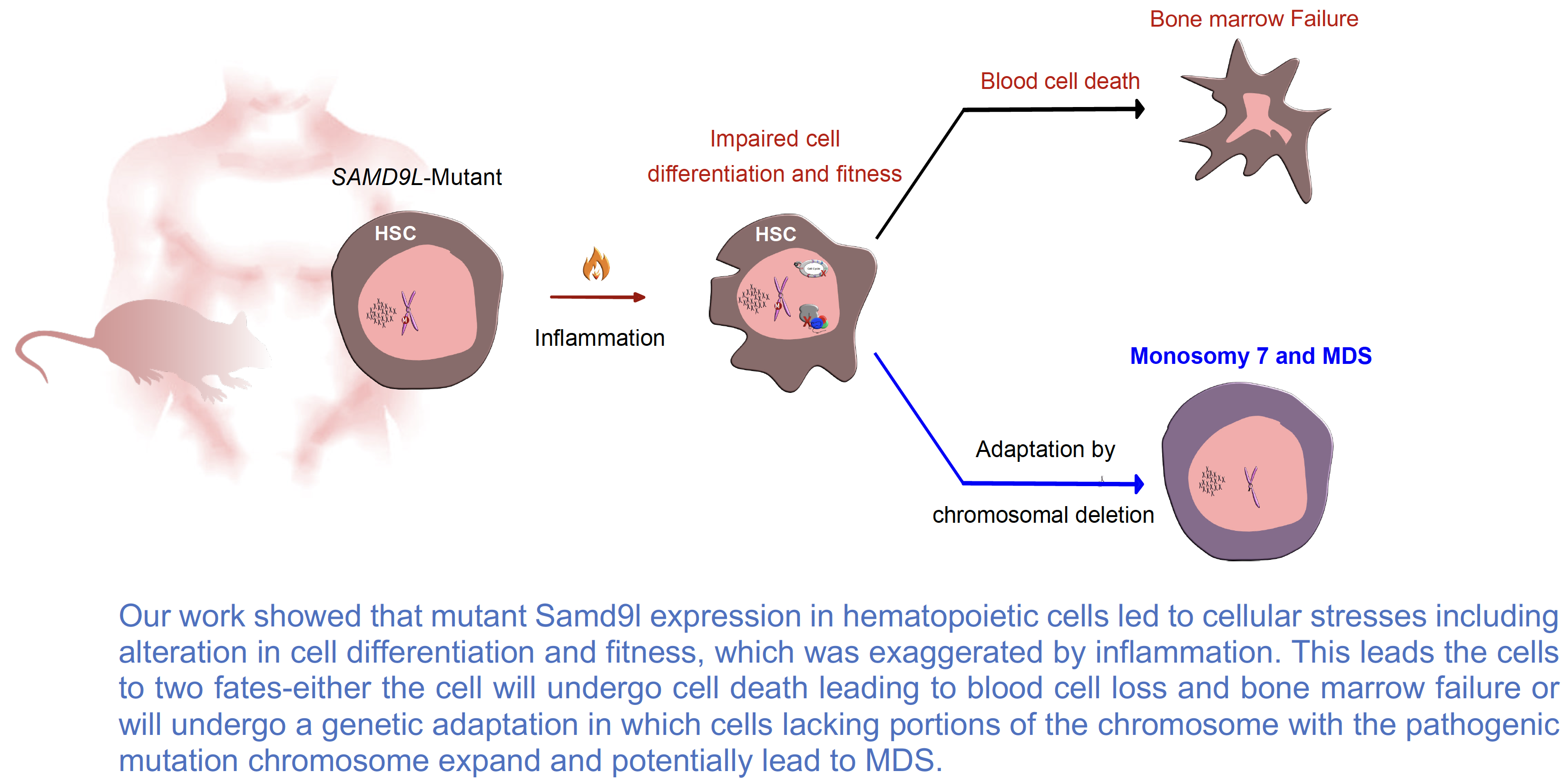 Our aim was to understand the contribution of germline mutations in SAMD9 and SAMD9L to normal blood cell formation and in the development of myelodysplastic syndromes (MDS). Patients with these mutations often suffer from decreased blood cells in the bone marrow and peripheral blood accompanied by fatigue, infections, and other complications. To release this pressure, mutant blood cells that lack the mutant allele, typically through copy number alterations, expand in the marrow but at the expense of potentially progressing to MDS due to the haploinsufficiency of chromosome 7 genes.