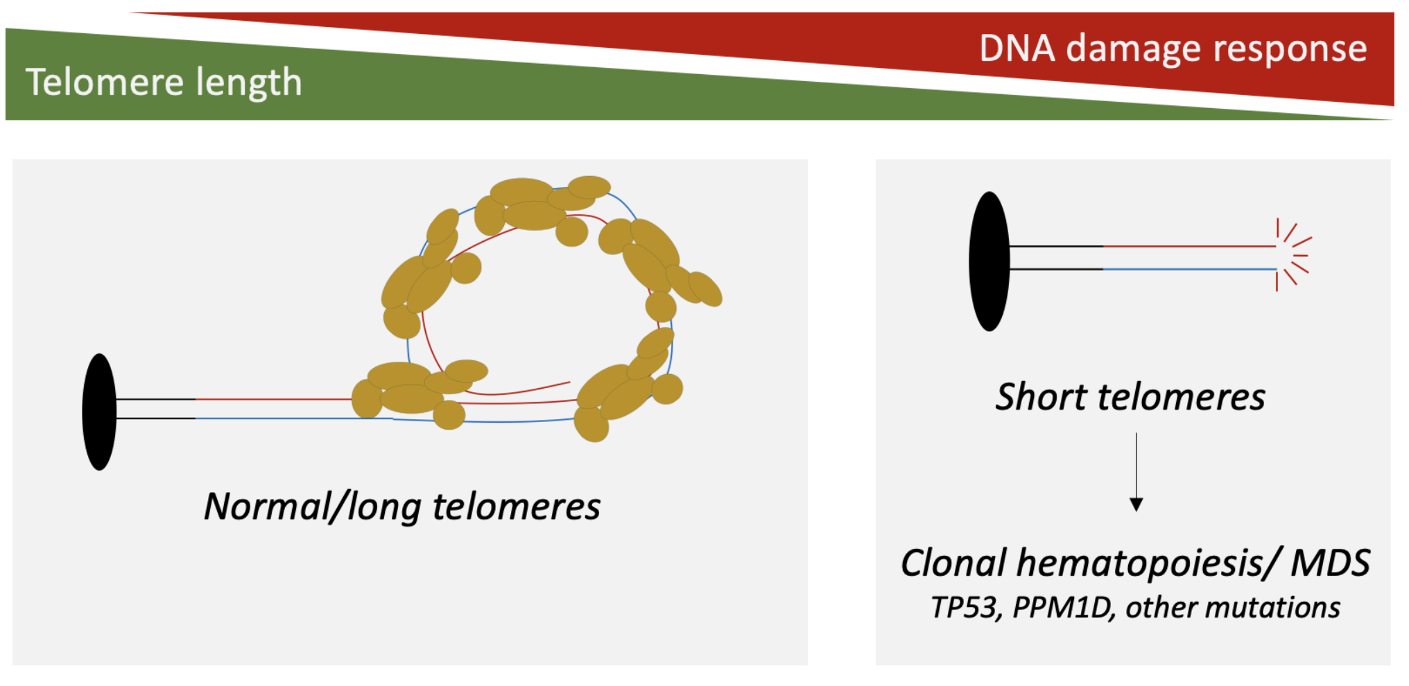 Telomeres are caps that protect the ends of chromosomes from deterioration. They are important for preventing premature cellular aging. Mutations that damage telomeres can be passed along in families, resulting in defects in blood cell formation and an increased risk of developing MDS and leukemias. We recently found that 3% of patients with MDS have inherited mutations in the TERT gene, and that these patients have increased toxicity with certain treatments. Further, the type of acquired (“somatic”) mutations that drive development of MDS appear to be shaped by the presence of underlying TERT mutations.