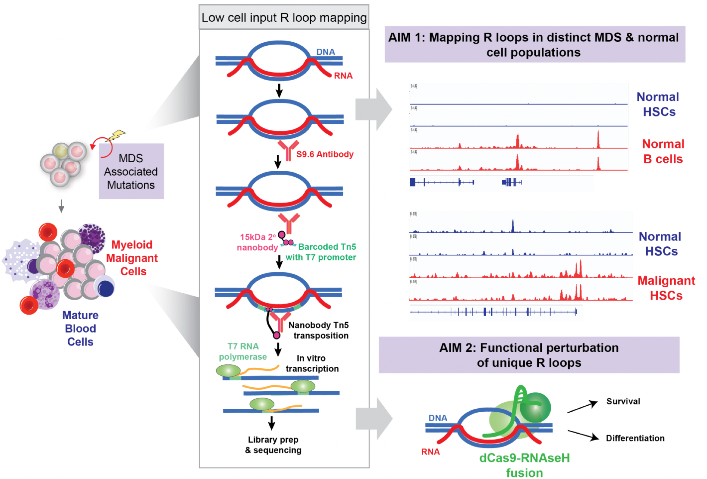 We have now used these techniques in blood stem cells and mature blood cells from mice as well mouse models of acute myeloid leukemia (AML). This effort revealed striking differences in the types of R loops between AML and normal cells as well as unique R loops in each distinct cell type. We now plan to perform similar studies in MDS patient samples and normal human bone marrow cells. Furthermore, we plan to study the actual function of individual R loops to determine how they contribute to MDS development and if their elimination can serve as a new potential therapy for MDS.