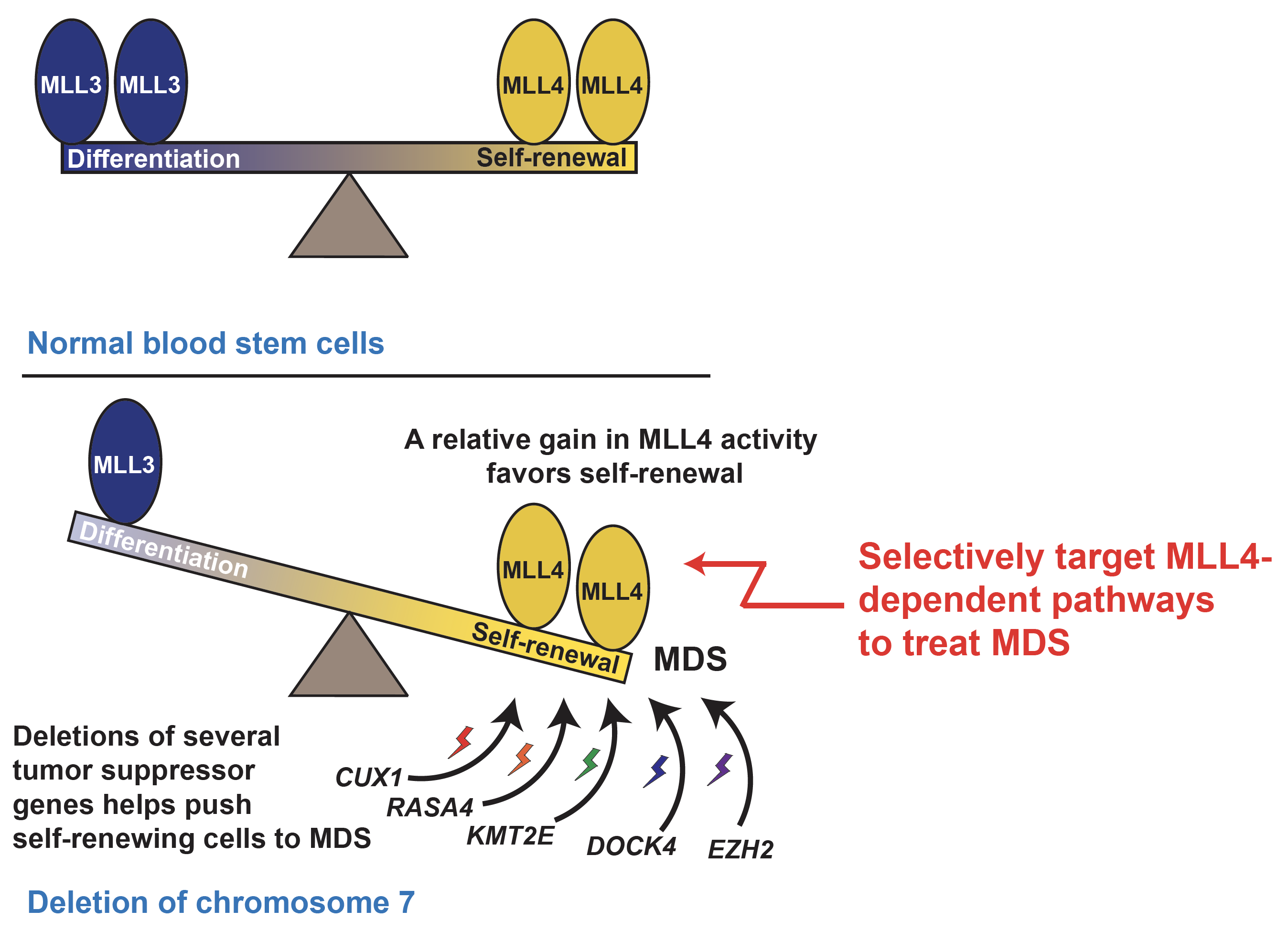Myelodysplastic syndrome develops when stem cells that normally give rise to healthy blood cells instead acquire mutations that lead to their uncontrolled growth. One common mutation involves loss of all, or even part, of chromosome 7. Chromosome 7 contains several genes that appear to limit stem cell growth, including a gene called MLL3. Our lab has used mice to show that MLL3 deletions can cause blood stem cells to reproduce themselves too many times when they encounter stressors such as chemotherapy or inflammation. We now propose new work to better understand how reductions in MLL3 levels, brought on by chromosome 7 mutations, can lead to MDS. The first aim of our proposal explores how reductions in MLL3 levels can alter the behavior of another, very similar gene called MLL4. Briefly, we believe that too little MLL3 activity leads to too much MLL4 activity, which then causes MDS. If we could restore the balance between MLL3 and MLL4, we could treat MDS cases that carry chromosome 7 deletions. The second aim of our proposal focuses on understanding how MLL3 interacts with other genes that are simultaneously deleted when MDS cells lose chromosome 7. This is important because MDS is not caused by mutations in just one gene; it is caused by many gene mutations working together. We have developed an approach to learn which mutation interactions are most impactful for MDS development and how they alter the biology of blood cells. This should again help us identify new drug targets to treat MDS.