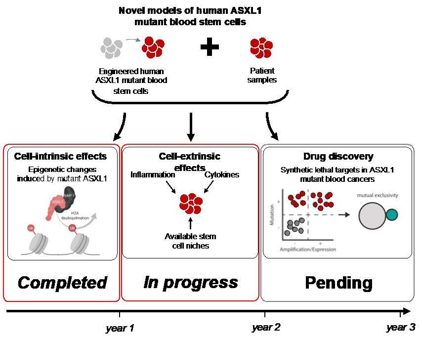 Our understanding of the development of blood cancers in general, and myelodysplastic syndromes (MDS) in particular, has improved markedly over the past decades. Importantly, the finding that specific mutations are sequentially acquired in individual genes has shed light on how blood cancers develop from healthy blood cells. The Majeti lab has contributed to our understanding of blood cancer development by identifying the initiating mutations in blood stem cells, termed pre-leukemic stem cells. Others have subsequently shown similar findings, and importantly were able to show that these initiating mutations can even be found in a significant proportion of healthy individuals, a condition termed clonal hematopoiesis. In these individuals, blood stem cells carrying these initiating mutations can ultimately lead to the development of myeloid malignancies, but in most cases do not. One of the frequently mutated genes in clonal hematopoiesis is ASXL1, which is thought to act as a regulator for how genes are activated. In patients with myeloid malignancies including MDS, the presence of a mutation in ASXL1 is associated with very poor prognosis including poor treatment response. Our understanding of ASXL1 mutations remains limited, most likely due to the lack of representative model systems, and to date, no treatment approaches for blood cancers with mutant ASXL1 have been developed. The goal of this project is thus to:
