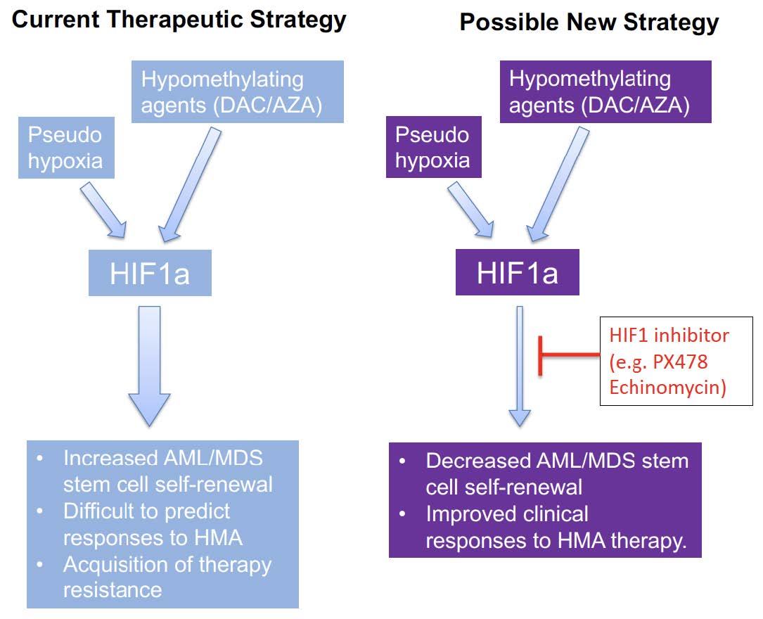 While much has been learned about the genetic origins of the myelodysplastic syndromes (MDS), relatively little is known about the factors that determine responses to one of the mainstays of MDS therapy –the hypomethylating agents (HMAs) – and it remains extremely difficult to predict which patients will respond to HMA therapy. Since response rates are modest and all MDS patients will eventually become refractory to HMA therapy, it is extremely important to better understand how these agents work in order to develop more effective therapeutic strategies. Our studies have identified hypoxia-inducible factor 1 alpha (HIF1a) as a critical regulator of HMA therapy resistance. We have investigated how HIF1a induces therapy resistance, and worked to identify the best HIF1a inhibitors to use in combination with HMAs to treat MDS patients. In the past year we have made significant progress with respect to these goals. In addition to identifying a list of candidate genes responsible for the effects of HIF1a, we have shown that MDS and AML patient cells are more sensitive to the combination of HMA and HIF1a inhibitor treatment than either alone. In addition, we have shown generated data indicating that in contrast to conventional thinking, the two major types of HMAs used to treat MDS patients work via unique molecular mechanisms. We also have generated data that the combination of HMAs with HIF1a inhibitors show promise as a therapeutic strategy based on their ability to eliminate leukemia cells in mice transplanted with human cells. Overall, these studies shed light on how HMA therapies induce their effects and demonstrate that HIF1a inhibition in combination with HMA therapy may be a viable and improved therapeutic strategy to treat MDS patients.