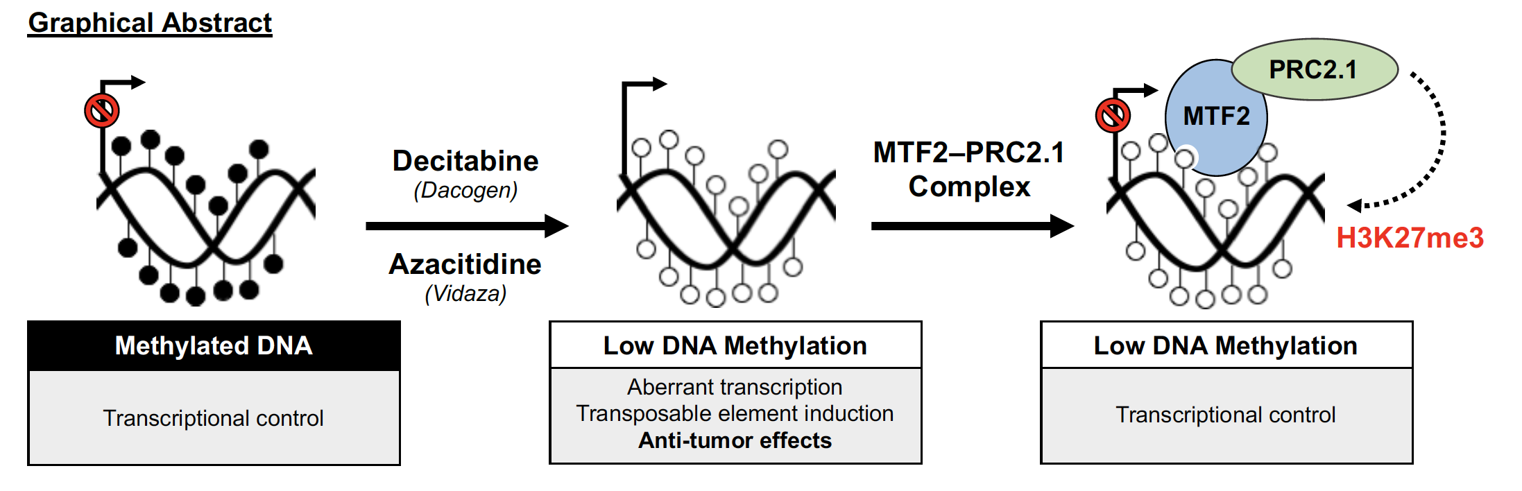 Myelodysplastic syndromes (MDS) are a heterogenous group of bone marrow stem cell disorders characterized by ineffective blood cell production and risk of progression to acute myeloid leukemia (AML). Drugs known as hypomethylating agents, including azacitidine (Vidaza) and decitabine (Dacogen), are cornerstone treatment options for MDS patients. Despite their clinical use for nearly two decades, the anti-tumor mechanism of action of these drugs remains poorly understood. The term hypomethylating agent stems from the ability of these drugs to block DNA methylation, a repressive epigenetic mark involved in gene silencing, but how this targets malignant cells in MDS remains unknown. Using genome- scale CRISPR screening approaches, we unexpectedly identified the gene Metal Response Element Binding Transcription Factor 2 (MTF2) as a critical genetic modifier of hypomethylating agent response in myeloid disease models. MTF2 is a DNA-binding, methylation-sensitive factor that recruits the Polycomb Repressive Complex 2.1 (PRC2.1) to hypomethylated genomic sites for gene silencing – this may be an important mechanism for maintaining transcriptional control following drug-induced loss of DNA methylation. In our proposal, we will determine whether genetic deletion of MTF2 and additional components of PRC2.1 sensitizes cells to hypomethylating agents in pre-clinical models of MDS. We will also determine the epigenetic mechanisms by which MTF2-PRC2.1 prevents the re-awakening of transposable elements, viral remnants that are abundant in the human genome, upon loss of DNA methylation. This work will improve our understanding of nt anti-tumor mechanism of action and offer insights into the development to new therapeutic strategies target DNA methylation in MDS.