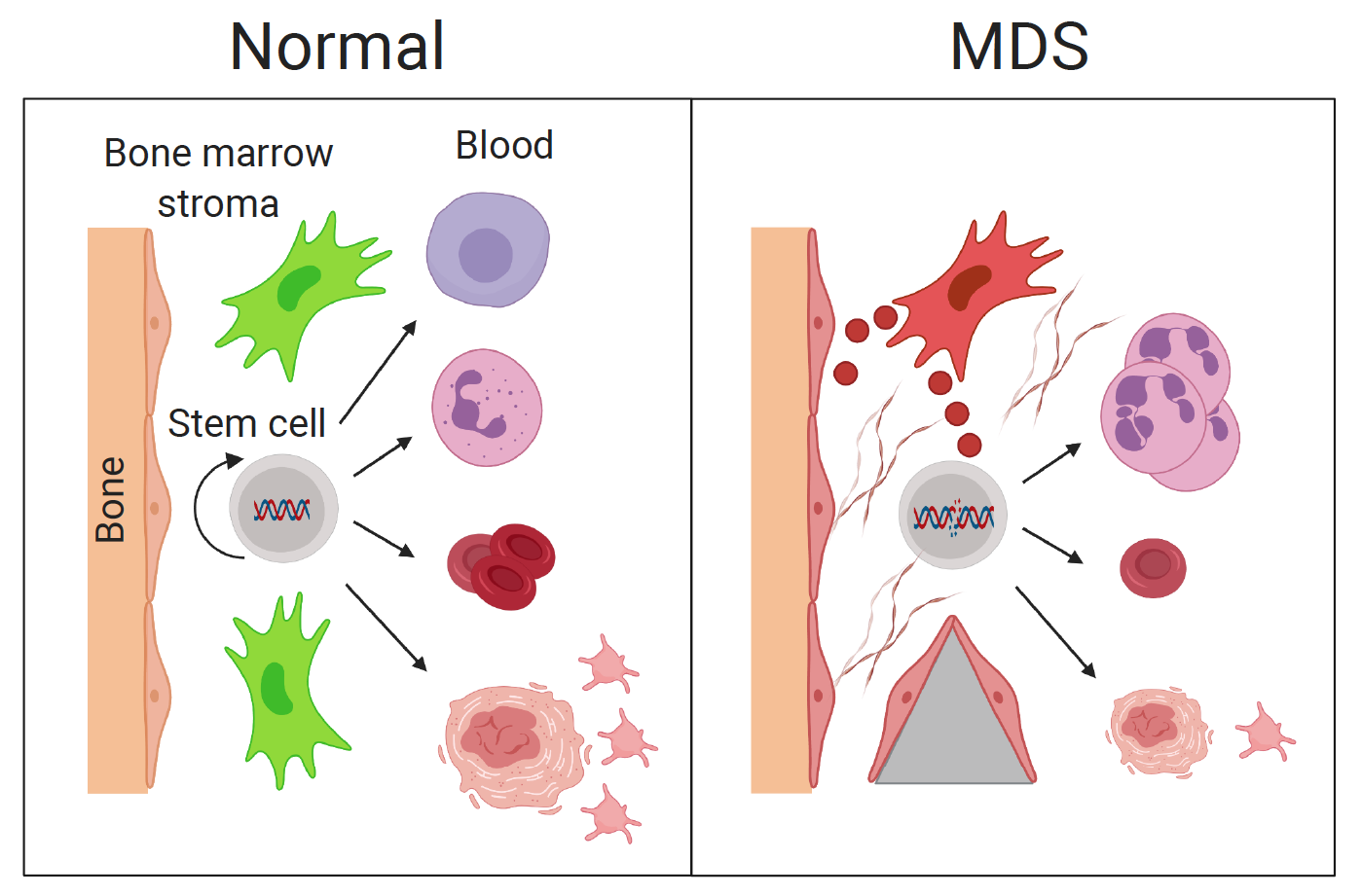 Myelodysplastic syndromes (MDS) are a group of diseases affecting the formation of blood, leading to reduced blood clotting, low red blood cell numbers, and increased risk of blood cancer (leukemia). These abnormalities are often caused by defects in the blood stem cells that normally reside in the bone marrow and sustain blood formation. In addition, many MDS patients show abnormalities in the bone marrow cavity such as the accumulation of connective tissue fibers that dislodge blood progenitor cells. The relative importance of the abnormalities of the bone marrow microenvironment (the so-called “niche”) versus blood stem cell defects are still poorly understood. We have been using two novel experimental animal models to study bone tissue-driven MDS and blood stem cell-driven leukemia, respectively. In the first model, the loss of genes that usually oppose cancer development (the so-called “tumor suppressors”) causes fatal MDS-like disease associated with excessive bone and fiber formation in the bone marrow. In the past year, we have generated strong evidence that the disease is caused by the defects in the bone marrow niche rather than in the blood cells themselves, and characterized these defects at the cellular and molecular level. In the second model, the introduction of genetic mutations specifically into blood stem cells of unperturbed animals allows us to trace the process of leukemia development and characterize the effect of these mutations on normal blood formation. Using this model, we found that the introduction of an oncogenic mutation in blood stem cells rapidly subverts the normal process of blood development, with mutation- carrying cells rapidly overtaking normal cells. We also identified the precise cellular stage at which mutant cells outcompete their normal counterparts, and began characterizing the mechanisms of this “hostile takeover”. We hope that this work would help identify novel mechanisms of MDS and leukemia formation that might be targeted by emerging therapies.