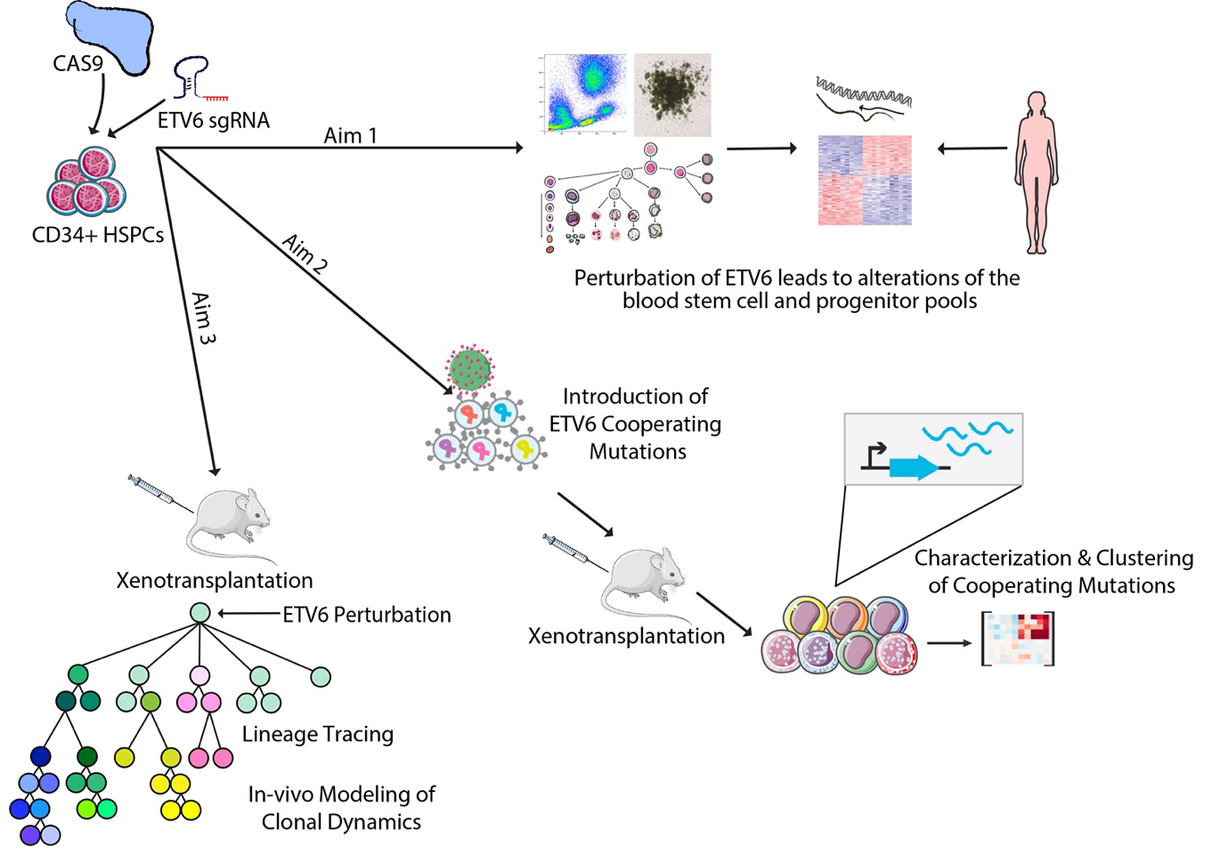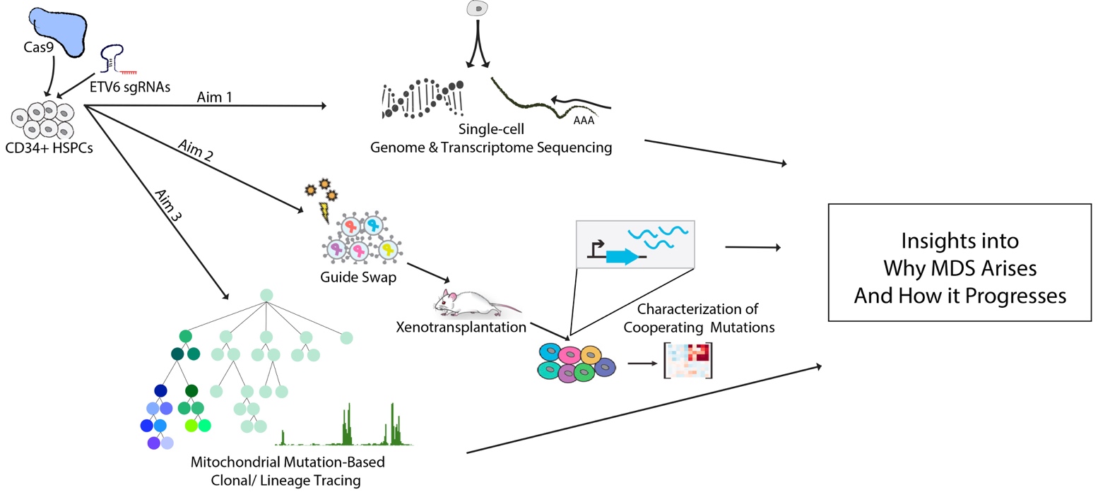 Patients with MDS often present with multiple disease-associated mutations affecting their blood stem cells. Furthermore, acquired ETV6 mutations have been established as a prognostic indicator of poor overall survival in patients with MDS. An ongoing aim of this project is to examine the clonal complexity of MDS. To further understand this, we will model how a variety of other mutations can act with ETV6 to cause MDS. For this, we have queried a local cohort of AML/MDS patients at our institution and obtained a list of gene mutations that commonly co-occur in the with ETV6 mutations. Using novel genome editing and screening strategies, we plan to leverage selective pressures from a known predisposing lesion in ETV6 on human blood forming stem cells to model clustering of such cooperating mutations. This will enable a more detailed understanding of whether and how certain mutations may cooperate, or interact directly, resulting in the heterogenous range of phenotypes along the MDS spectrum. We have recently significantly advanced our ability to carry out these screens by developing improved expression vectors that can also be detected with single-cell gene expression profiling. Finally, using an innovative lineage tracing approach that we have recently significantly advanced over prior approaches, we will dissect how disruption of ETV6 can alter the number of clones that compose the blood cell compartment. These experiments will provide additional insights into how ETV6 and other similar kinds of mutations can result in MDS progression. Continued funding from the Evans Foundation would enable us to continue these critical studies that should help improve our understanding of MDS predisposition and progression.