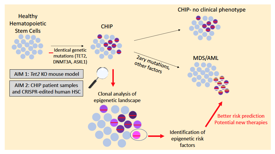 Blood stem cells are the gatekeepers of blood production: they are extremely long lived and upon differentiation can give rise to all types of mature cells, including white blood cells, red blood cells, and platelets. While people age, their blood stem cells are more easily damaged and acquire mutations in their DNA. This is a very common process that occurs in >10% of all individuals over 65 years of age. If these mutations confer a growth advantage to blood stem cells the mutated cells become overabundant in a process called Clonal Hematopoiesis of Indetermined Potential (CHIP). People with CHIP are clinically healthy, but have an increased risk of developing blood diseases, such as myelodysplastic syndromes (blood stem cells fail to make enough healthy blood) or acute myeloid leukemia (a type of blood cancer where malignant cells fill the bone marrow and interfere with the body’s normal blood cell production) and cardiovascular disease. Currently, it is not known why some mutated blood stem cells become tumorigenic and why some remain fully functional. There are multiple molecular layers that define the identity and the functionality of each stem cell: while all the cells share the same DNA sequence, they differ in the epigenome that governs what portions of the DNA are active or silenced. Preliminary experiments by us revealed that there are some markers in the epigenome that predict whether a CHIP mutation will provide a competitive advantage or not. This is not due to the mutation itself. Rather, the mutation is ‘interpreted’ through the epigenome and some cells have an epigenome that predisposes the cell to overgrowth. The aim of this proposal is to extend these studies to test the effects of the epigenome in i) mouse bone marrow transplantation studies of mutated stem cells or ii) in human bone marrow samples. We will molecularly analyze single cells to validate the causal connection of the epigenetic markers with the outgrowth and transformation of blood stem cells. If successful, this work will provide insight into how CHIP mutations can lead to diverse outcomes providing potential therapeutic targets. In addition, it may lead to a molecular signature signifying increased risk. This may then be tested as a prognostic indicator for patients.