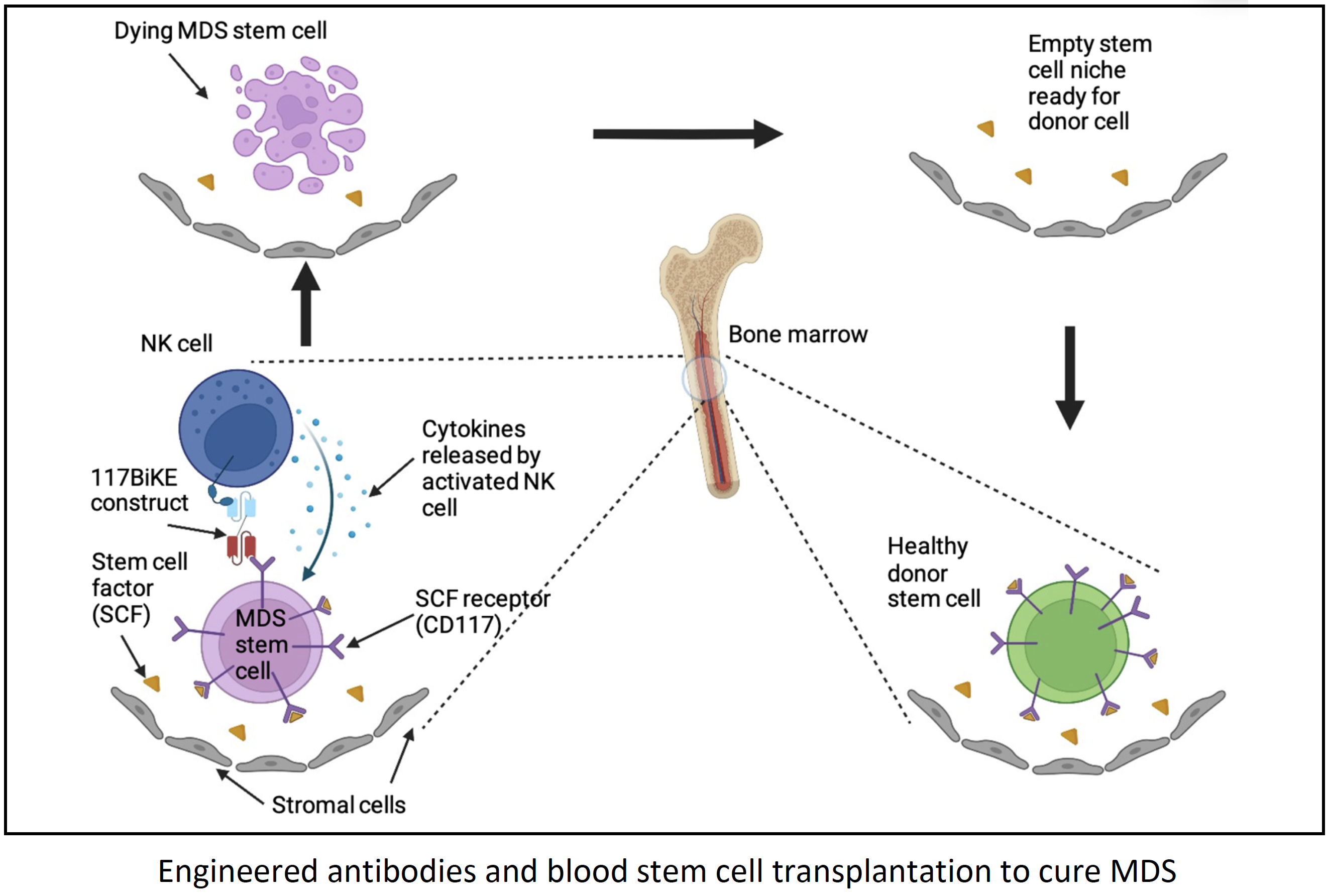 In the proposed project we have designed new versions of the CD117 antibody that can directly link natural killer (NK) cells to the MDS stem cells. NK cells are type of “fighter” immune cell that the unique ability to identify and kill “stressed” cells such as cancer cells and infected cells while sparing normal cells. NK cells display many activating molecules on their surface and prominent among them are CD16 and NKp46. We have designed antibody constructs that can bind to CD117, CD16 and NKp46 simultaneously, thereby bringing NK cells in direct proximity to the MDS stem cells. With this approach we anticipate better killing of the MDS cells without added toxicity. T-cells are another type of immune fighter cells that are well known for their cancer killing ability. For comparison, we have also designed antibody constructs, that will bring T-cells close to MDS cells, by binding to CD117 and CD3 (on the T-cells) simultaneously. We will compare these two types of immune fighter cells not only in their ability to eliminate MDS stem cells but also to create a conducive environment for the new healthy donor cells to grow. Eventually the goal is to design a transplant regimen that is effective in eliminating diseased stem cells and allow growth of normal donor stem cells and yet is gentle enough to be given to all patients with MDS who could be cured by the transplant procedure.
