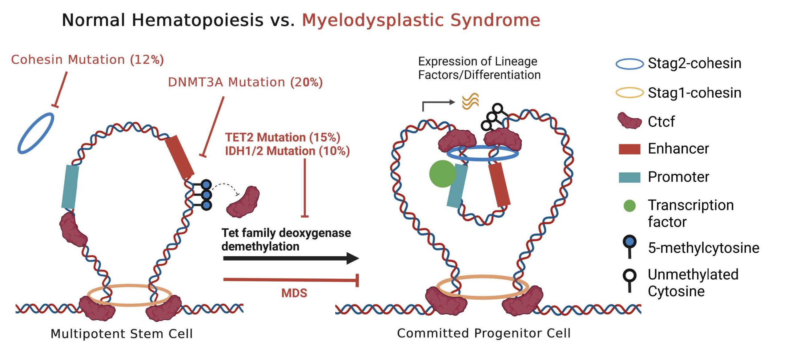 The human bone marrow stem cell is charged with the daunting task of multilineage blood cell production over a lifetime. This process requires sophisticated control of competing gene expression patterns—either to maintain as a stem cell or to commit to mature red cells, white cells or platelets. Aging, DNA mutations, and stem cell exhaustion are competing pressures that can result in defective abnormal bone marrow stem cells unable to effectively participate in blood cell formation in the disease myelodysplastic syndrome (MDS).  In the last decade, unprecedented research efforts have revealed key genetic events that characterize MDS which include mutations in genes responsible for adding or removing single carbons directly to DNA (methylation) as well as genes responsible for the shape and architecture of DNA (chromatin). For several decades, a mainstay of MDS treatment has been hypomethylating agents (HMA), which aim to remove these single carbon methyl groups, however, HMA therapy is only effective in ~20% of MDS patients. Much research has previously focused on the genes directly attached by these methyl groups, but how abnormal methylation causes MDS as well as how removal of DNA methylation improves blood cell formation remains unknown. In my proposal I aim to link DNA methylation with DNA architecture as a convergent mechanism for abnormal bone marrow function in patients with MDS. Using genetically faithful models of human MDS with either genetic impairment of demethylation or genetic impairment of DNA architecture, I aim to establish the effects of alterations in DNA methylation on DNA structure and its effects on gene expression patterns. Using these data, we will establish patterns of methylation and DNA structure from frozen samples of MDS patients who either responded exceptionally well to HMA therapy or patients in whom the therapy failed. This proposal will test the hypothesis that methylation patterns influence DNA structure and that can predict whether a given MDS patient’s DNA is amenable to restructuring/re-programming through HMA therapy. Information from these studies would be used to develop a clinical test to help identify patients likely to benefit from HMA therapy as well as to identify innovative targets for therapeutic bone marrow reprogramming for MDS patients.