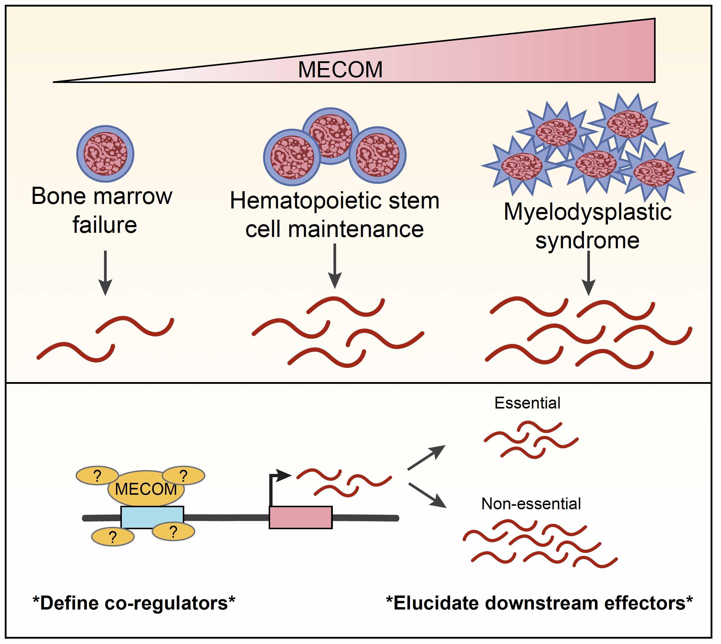 Human blood stem cells produce more than 500 billion new blood cells per day and this process must continue for 8 decades or longer, requiring preservation of the stem cells themselves to support this massive blood cell production. Precise molecular signals are necessary to maintain this balance of stem cell preservation and blood cell production and when these signals are disrupted blood cell production can either be irreversibly shut down in a condition known as bone marrow failure, or be hyperactivated as in myelodysplastic syndrome (MDS) and acute myeloid leukemia (AML). My prior work showed how a gene called MECOM is crucial to regulate the expression of an important set of several hundred genes that collectively maintain this balance – not enough MECOM causes bone marrow failure and too much MECOM leads to MDS and AML. In addition, MDS with high levels of MECOM is a particularly aggressive form of the disease, and there are no current treatments that specifically interfere with MECOM activity. In this proposal, I seek to better understand how high MECOM expression leads to MDS by looking at two aspects of MECOM signaling. First, I will use precise and synchronized destruction of the MECOM protein in AML cells to uncover the immediate cellular and molecular consequences of MECOM loss. In this way, I will describe how MECOM affects the structure of DNA loops and how that structure makes DNA more or less available to interactions with important cooperating regulator proteins. While I will detect changes across the entire genome of AML cells, I will also specifically hone in on two co-factors that I discovered in my previous work to compete with MECOM in the control of these important genes. Second, I will systematically examine each of the genes specifically regulated by MECOM to determine which individual genes are required for MECOM to cause MDS. My initial studies have shown that one of these gene in particular is necessary for the long-term survival of AML cells and high expression of this gene in patient MDS bone marrow samples is associated with a more aggressive disease course. I will investigate the function of this MDS-essential gene and develop specific methods to disrupt its function in a way that could potentially be used as a targeted therapy for MDS patients in the future.