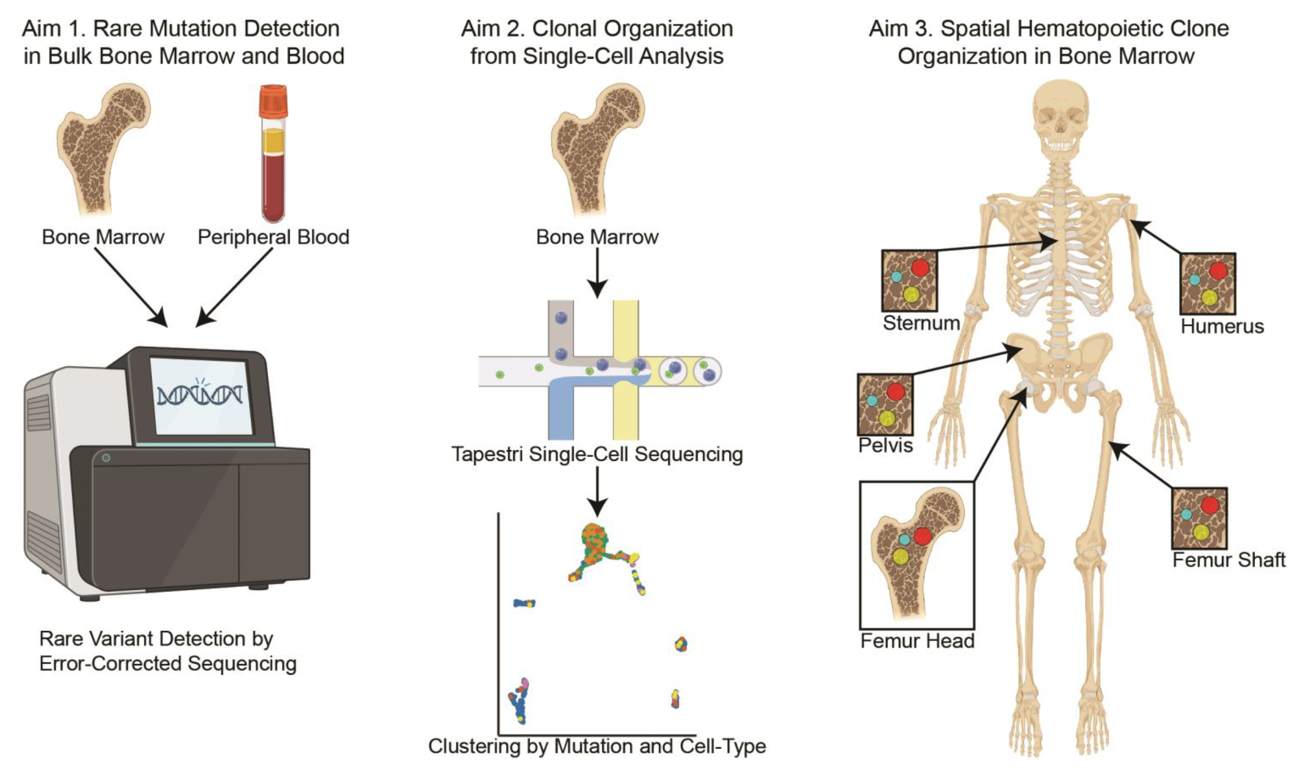 To answer these questions, we have developed methods for spatially-aware mutation detection in the BM. In a pilot study, we characterized the BM of an individual with polycythemia vera—a myeloproliferative neoplasm. Surprisingly, we found striking spatial segregation of somatic mutations in the BM and a complex clonal organization by single-cell analysis. Here, we plan to use these tools to characterize the spatial and clonal distribution of CH in the BM of cancer-free adults. This will define how CH clones are organized in the BM and how their clonal dynamics can lead to MDS. Long-term this will inform efforts to develop interventions to prevent the transformation of CH into MDS.
