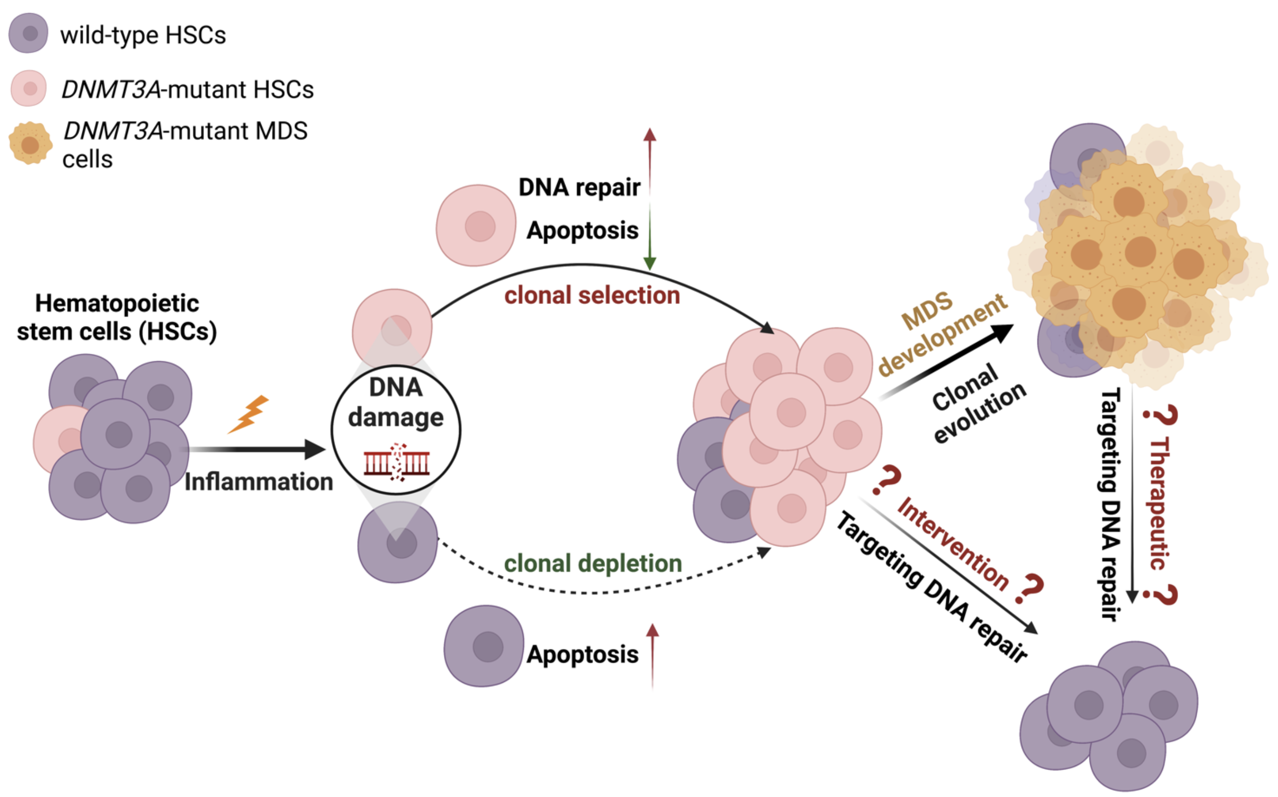 Cumulative evidence has suggested that inflammatory stress may prime DNMT3A-mutant clonal hematopoiesis into MDS development. We previously reported that chronic type II interferon signaling selects for DNMT3A– mutant HSCs while causing wild-type HSCs exhaustion. This fitness advantage of the mutant HSCs was attributable to the resistance to HSC activation and apoptosis. Interestingly, activated mutant HSCs remain apoptotic-resistant during interferon signaling stress. These data suggest additional mechanisms protect the proliferative mutant HSCs from interferon signaling associated depletion. Our preliminary data have indicated that proliferative mutant HSCs may repair inflammation-induced DNA damages more efficiently, at least partly attributable to the increased non-homologous end-joining DNA repair pathway activity. Inhibiting this pathway sensitized the mutant but not control mouse MDS-like blasts to interferon signaling induced cell death. Therefore, we hypothesize that targeting this DNA repair pathway may abolish the selective advantage of DNMT3A mutant HSCs during inflammatory stress and thus minimize the risk of MDS development and progression. Herein, we propose directly assessing the therapeutic potential of targeting DNA repair (NHEJ) in the clonal expansion and MDS development mouse models, as well as primary patient samples. We will also explore the molecular dependencies of the increased NHEJ in the mutant HSCs during inflammatory stress to identify possible targets for specific elimination of DNMT3A-mutated HSCs as an early intervention/therapeutic strategy to minimize MDS risks/treat DNMT3A-mutated MDS patients.