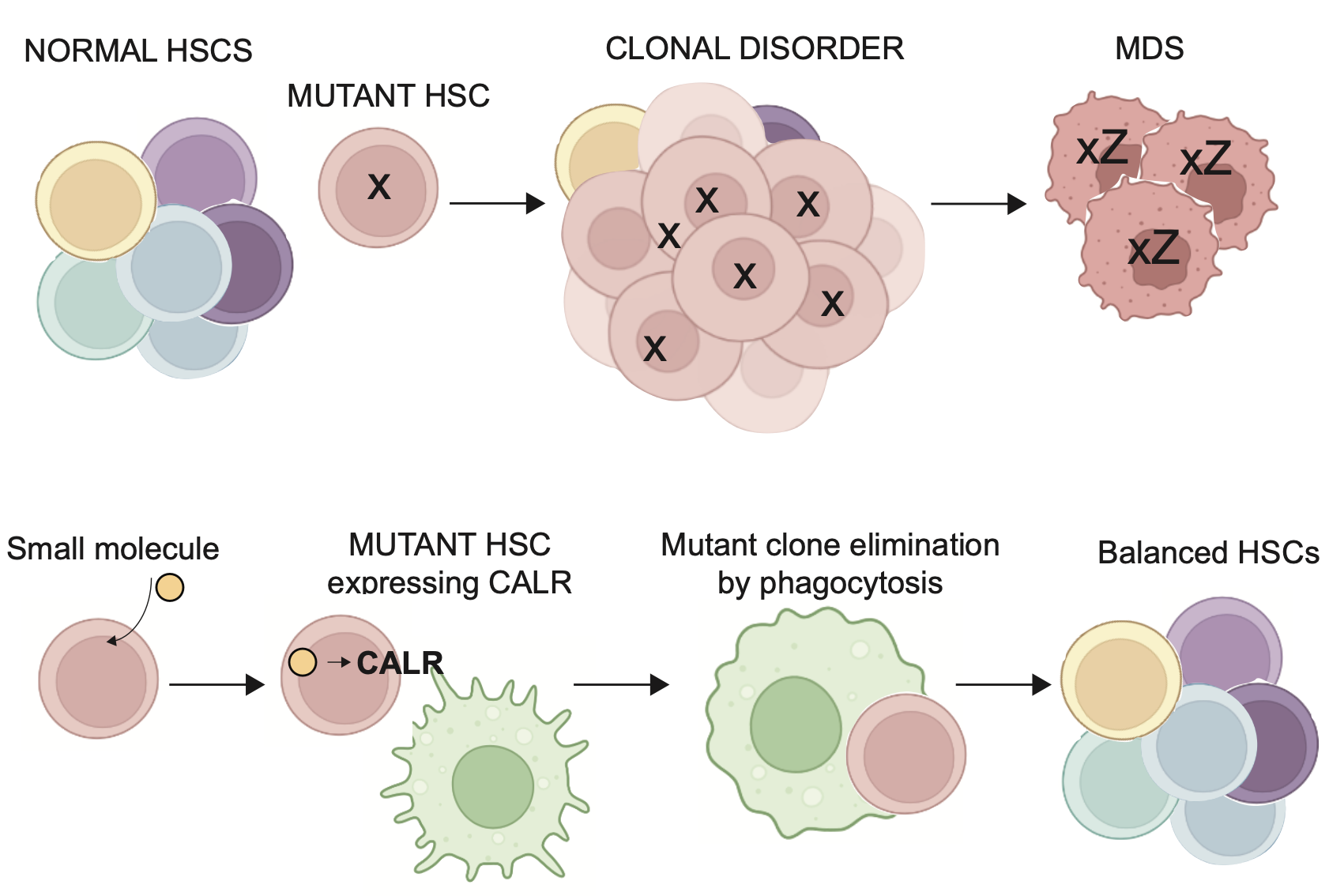 In many adult tissues, the maintenance of organ function depends on stem cells. Although there is a requirement of stem cells for tissue repair, it is unknown if the stem cells are quality assured in any manner. In this study, we will study a new quality assurance mechanism for blood stem cells (HSPCs) in vivo and this may have implications for a target treatment of myelodysplastic. syndromes (MDS). Macrophages interact with HSPC during development through two independent behaviors. A macrophage may completely engulf (“eat”) a stem cell or may scan the stem cell and capture small pieces of it. In the latter situation, the stem cell goes on to divide. This interaction is mediated by the “eat me” signal calreticulin (CALR) on the surface of HSPCs. Macrophage depletion led to unbalanced HSPC diversity in the adult marrow, suggesting that a quality assurance mechanism for stem cells is operative. We plan to define the signals triggering CALR expression on the HSPC surface mediating the removal or amplification of the stem cells. We envisioned that surface CALR is sensed by the macrophages to control the stem cell quality and thought to identify the quality control “code” which is surveilled by the macrophages. We anticipate that understanding the molecular cues underlying the surface CALR expression and its outcome will allow us to use HSPC-macrophage interaction to directly target abnormal HSPCs in MDS. This will prevent the establishment of a malignant clone. We propose to identify candidate pathways that may be underlying the proposed quality control assessment by taking advantage of the surface CALR levels on the stem cell membrane and perform a chemical screen on human cells to find pathways that enhance surface CALR on hematopoietic stem cells. We will validate these chemicals in zebrafish by adding small molecules and monitor the interaction of macrophages and HSPCs in vivo. To further evaluate the treatment specificity that mediates macrophage and HSPCs interaction through CALR we will validate our findings using an in vitro approach, probing CALR expression on the HSPCs membrane and their ability to interact with macrophages. We also will undertake a gene knockout-based screen in hematopoietic cells to evaluate pathways required for surface CALR. These studies will be followed by genetic studies, biochemistry, and chemical genetics to probe the pathways that affect the quality assurance of stem cells. Finally, we plan to study if these chemicals have selected induction of surface CALR on common affected genes in myeloid disorders, namely, ASXL1 and DNMT3A, mutant clones compared to wildtype clones. We propose that understanding the molecular cues underlying the surface CALR expression and its outcome will allow us to directly target abnormal HSPCs clones in clonal hematopoiesis and MDS for macrophage removal.